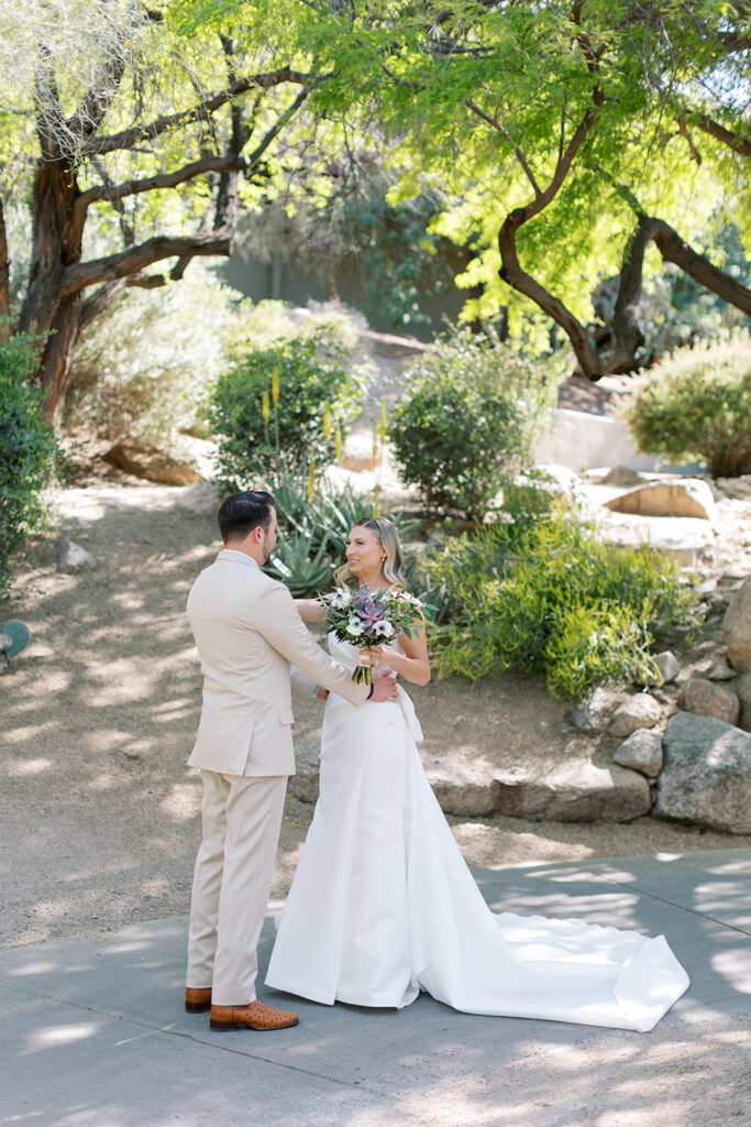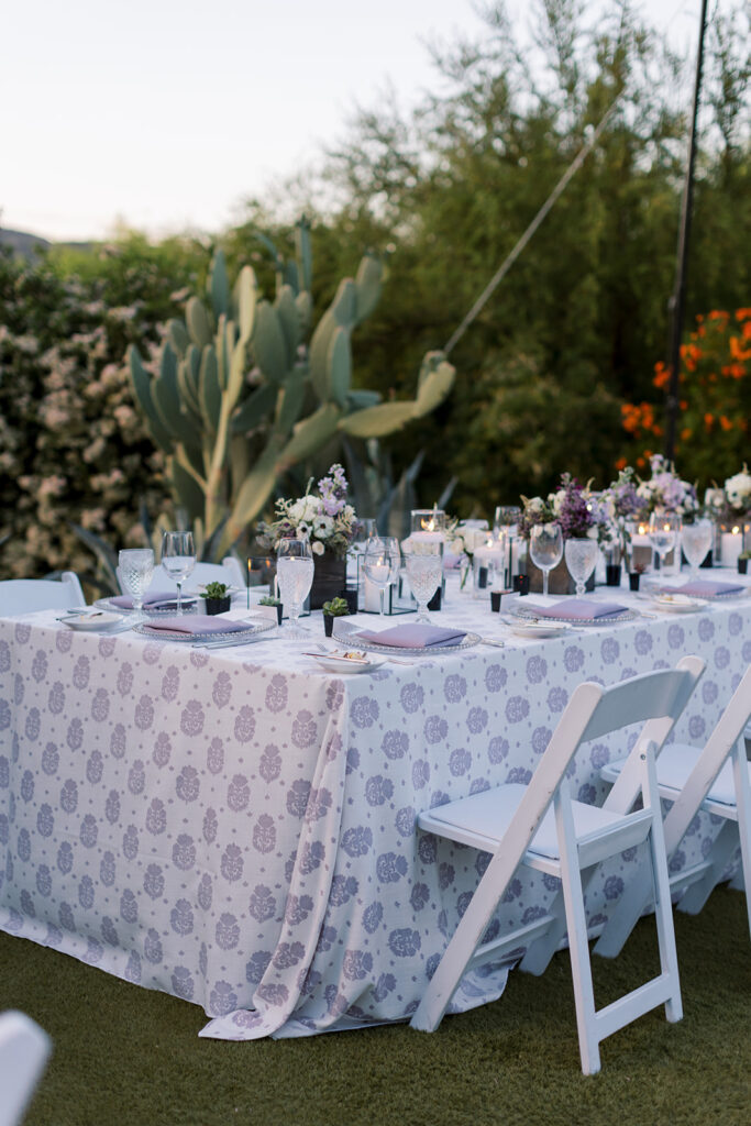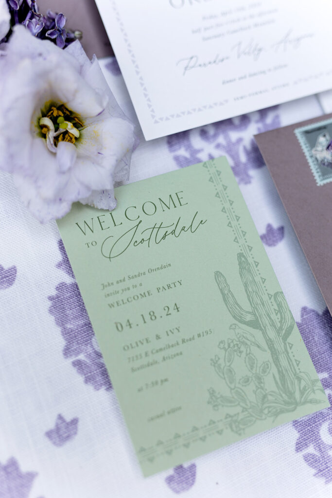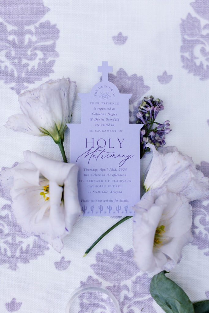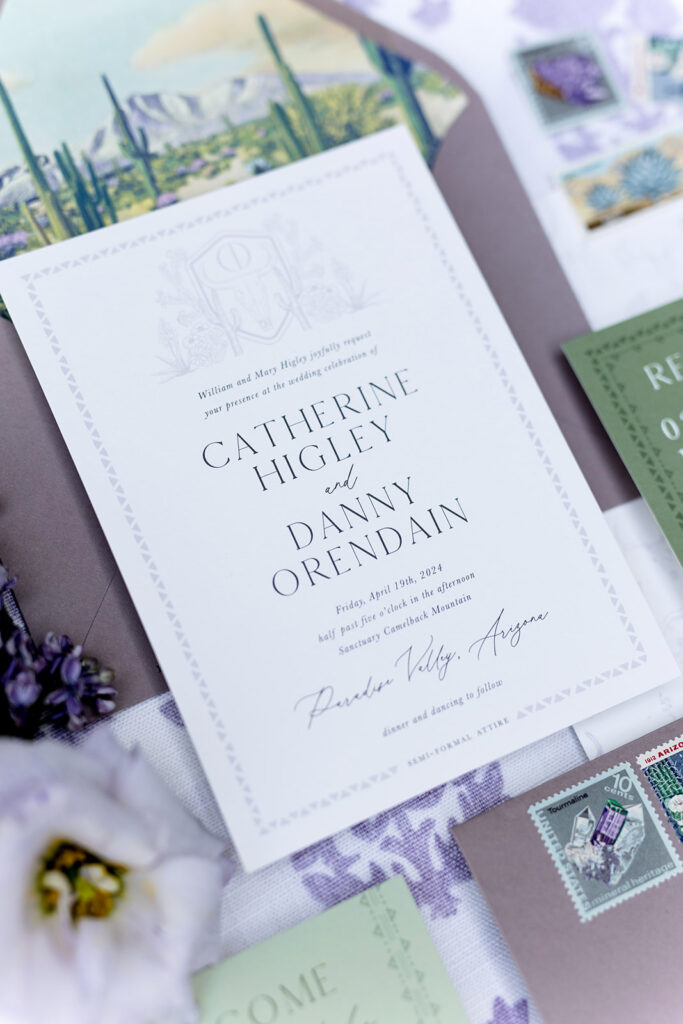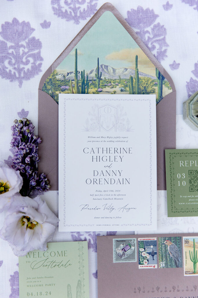 Cat and Danny’s wedding at Sanctuary Camelback Mountain was a fresh take on desert romance, blending soft lavender and lush greens with a distinct western flair. From the very first detail, desert-inspired invitations hinting at the landscape to come, guests were immersed in a design that felt both elevated and deeply personal.