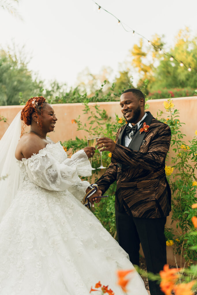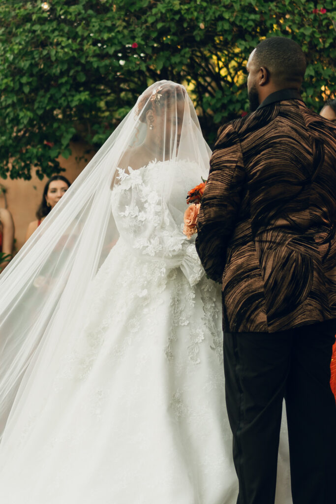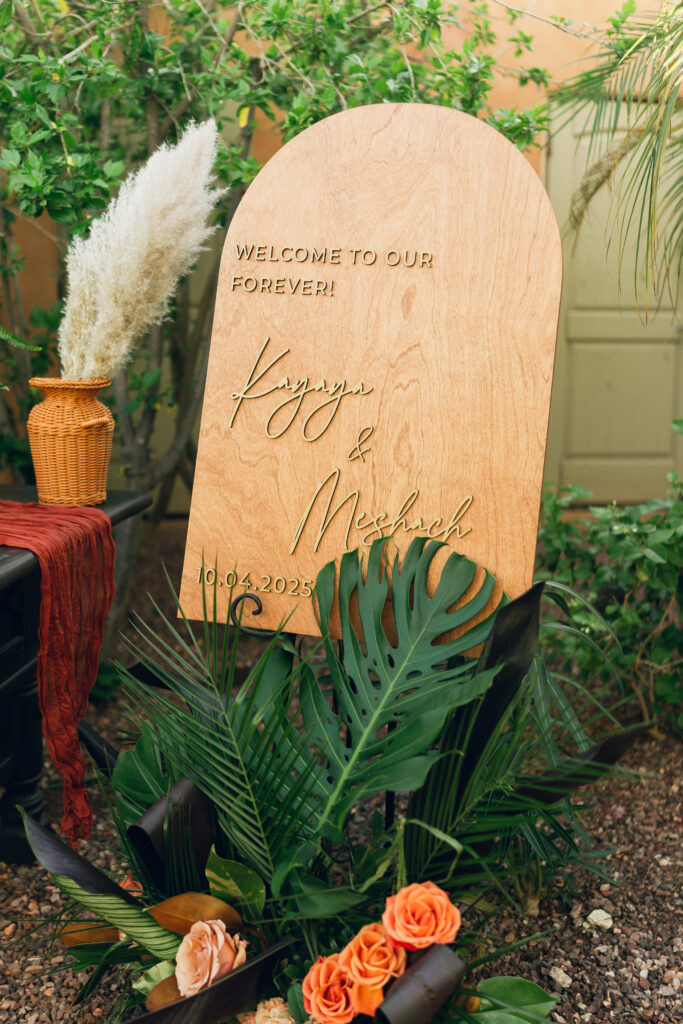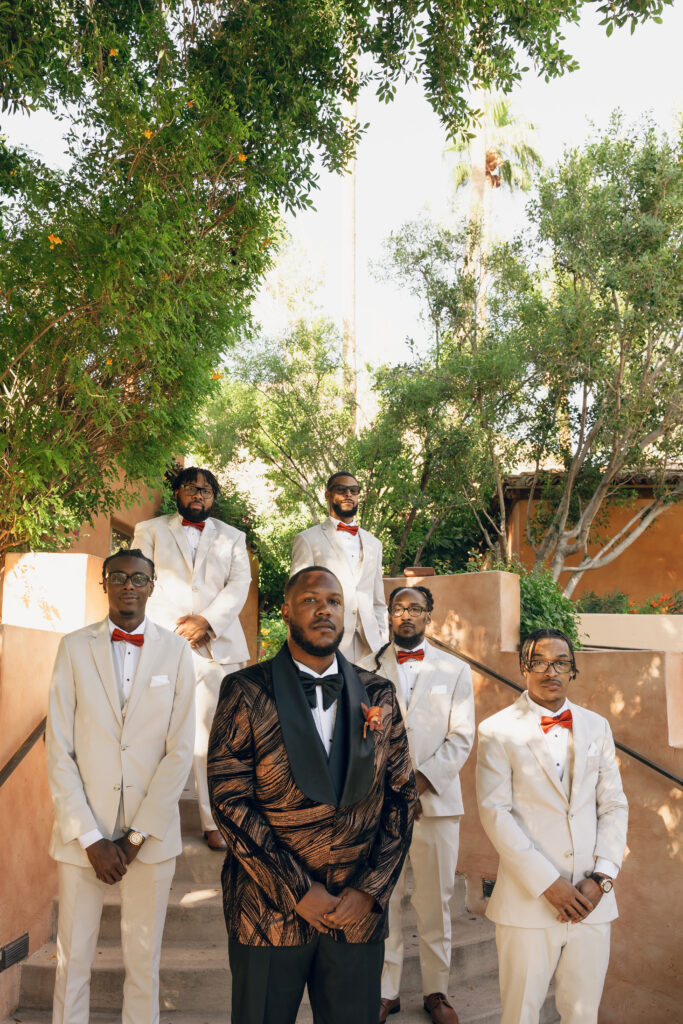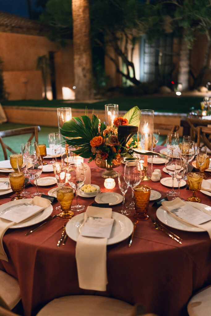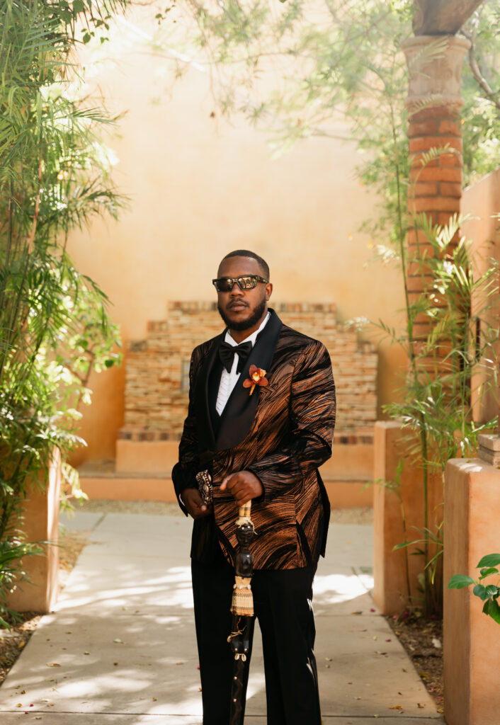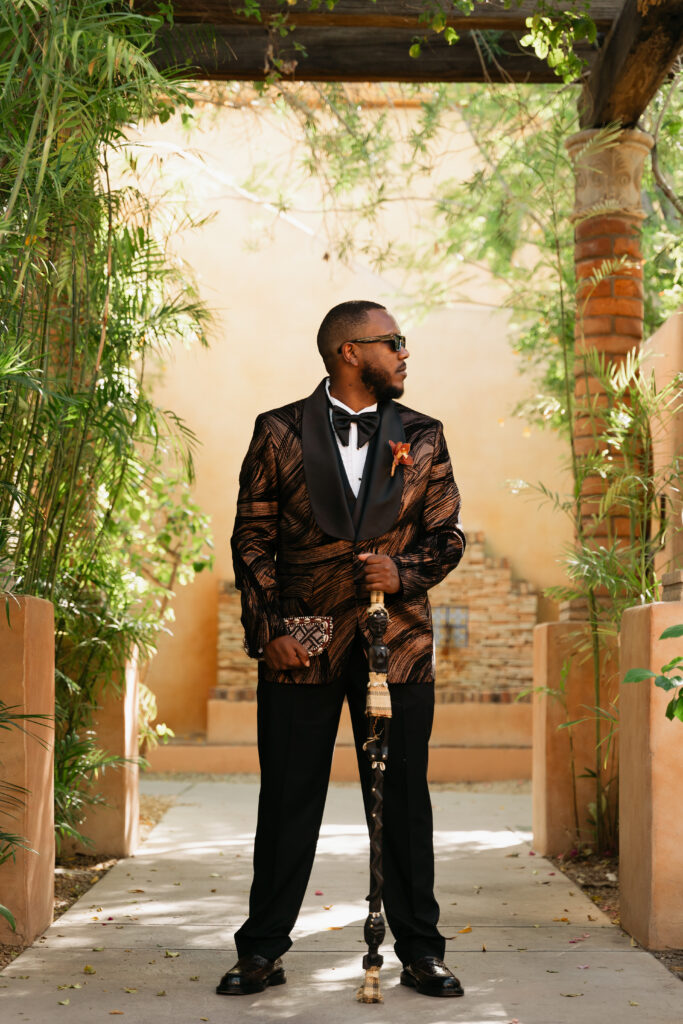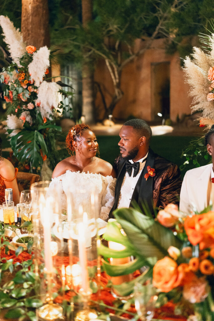 From my very first call with Kayaya, I knew this wedding would be two things: a huge, joy-filled party and a celebration rich with tropical elements inspired by her Congolese heritage. With Kayaya living in Texas and Meshach in Nashville, creating a wedding atmosphere that allowed them, and their guests, to “travel” somewhere new together felt especially meaningful. The moment Kayaya stepped onto the grounds of Royal Palms, she knew it was her dream venue. From that point forward, her vision never wavered: warm, saturated hues, real palm leaves, and gold accents that brought a lush, tropical feel to the Arizona desert.