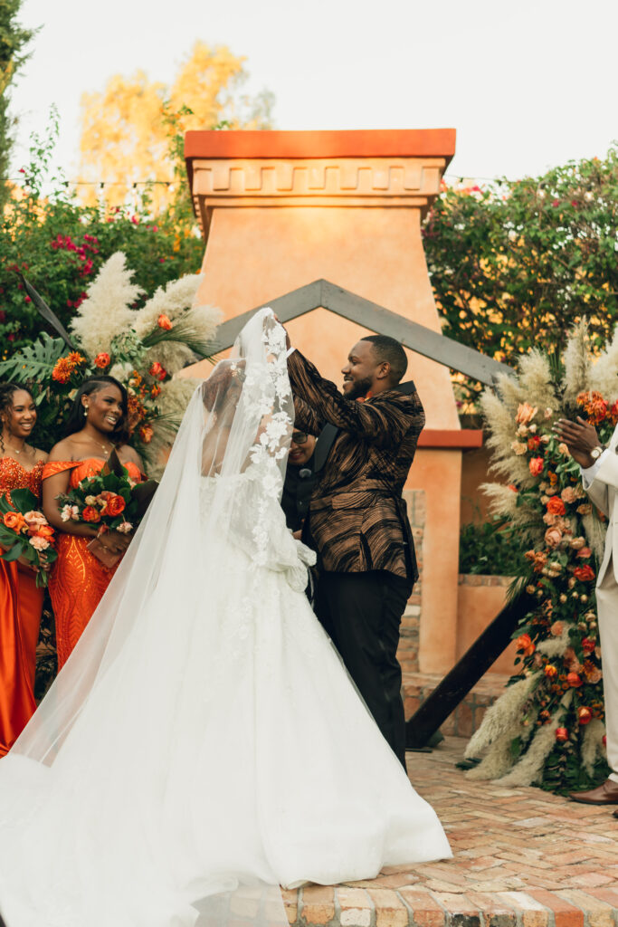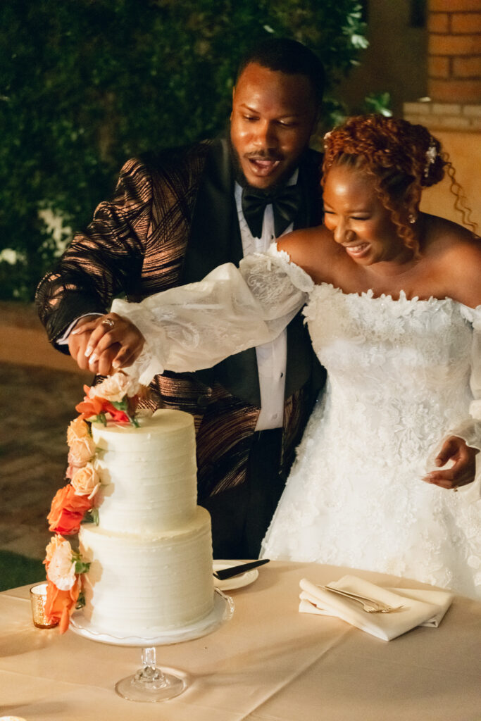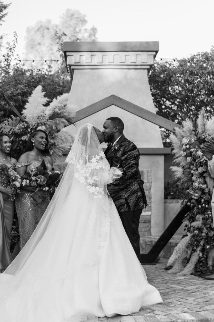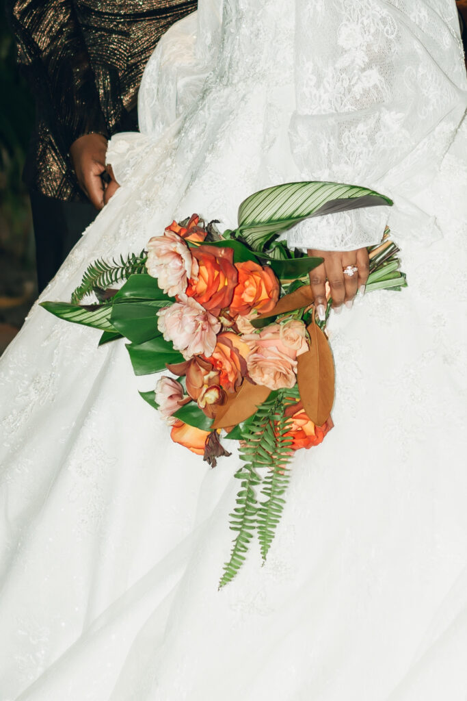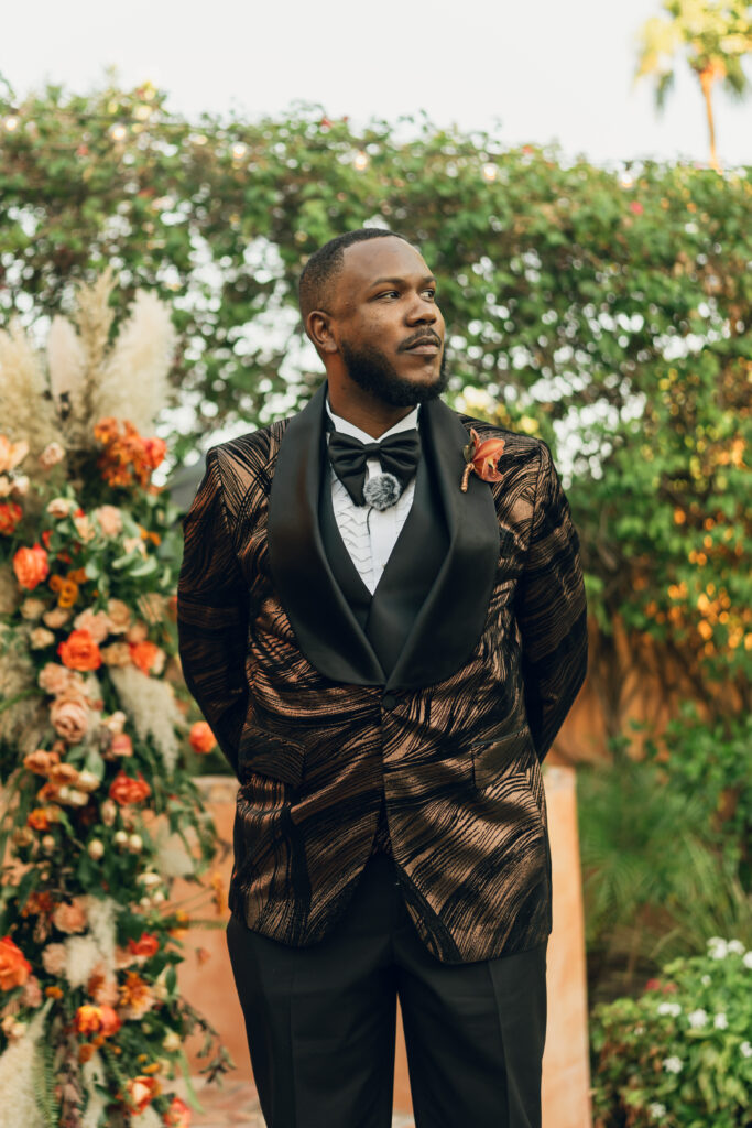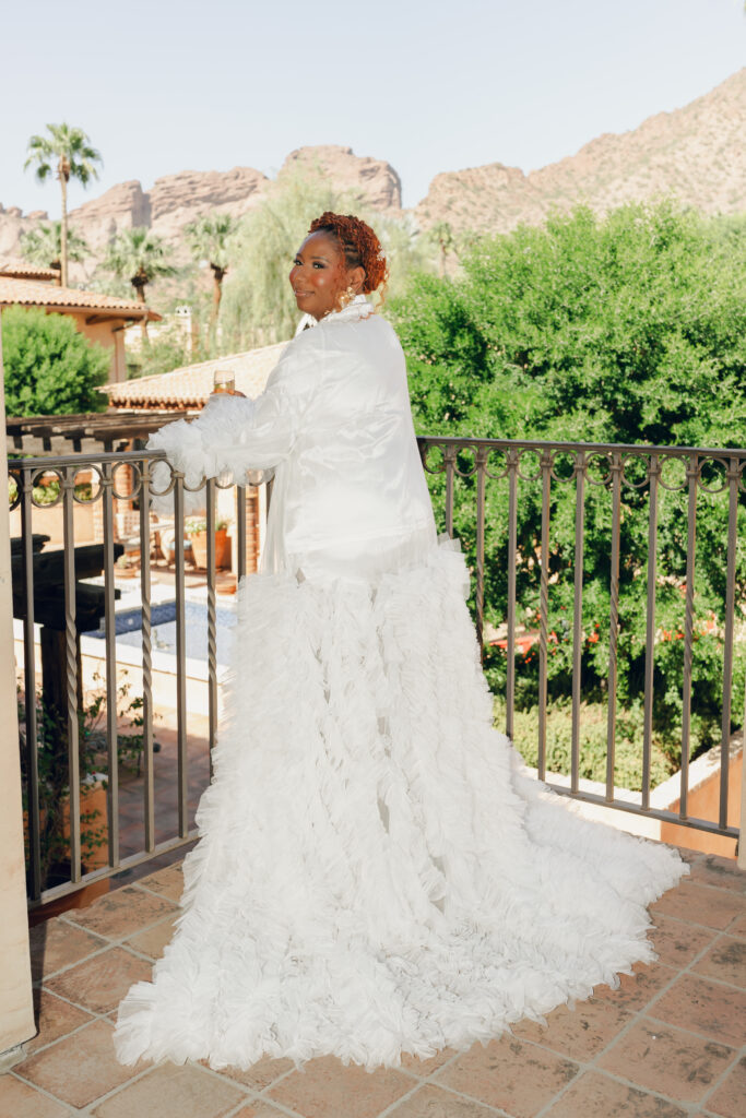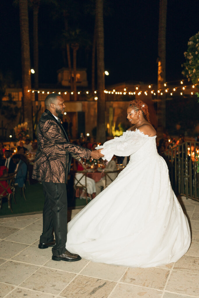 From my very first call with Kayaya, I knew this wedding would be two things: a huge, joy-filled party and a celebration rich with tropical elements inspired by her Congolese heritage. With Kayaya living in Texas and Meshach in Nashville, creating a wedding atmosphere that allowed them, and their guests, to “travel” somewhere new together felt especially meaningful. The moment Kayaya stepped onto the grounds of Royal Palms, she knew it was her dream venue. From that point forward, her vision never wavered: warm, saturated hues, real palm leaves, and gold accents that brought a lush, tropical feel to the Arizona desert.