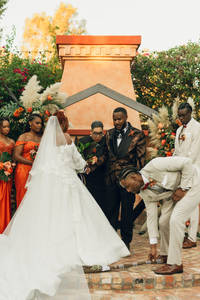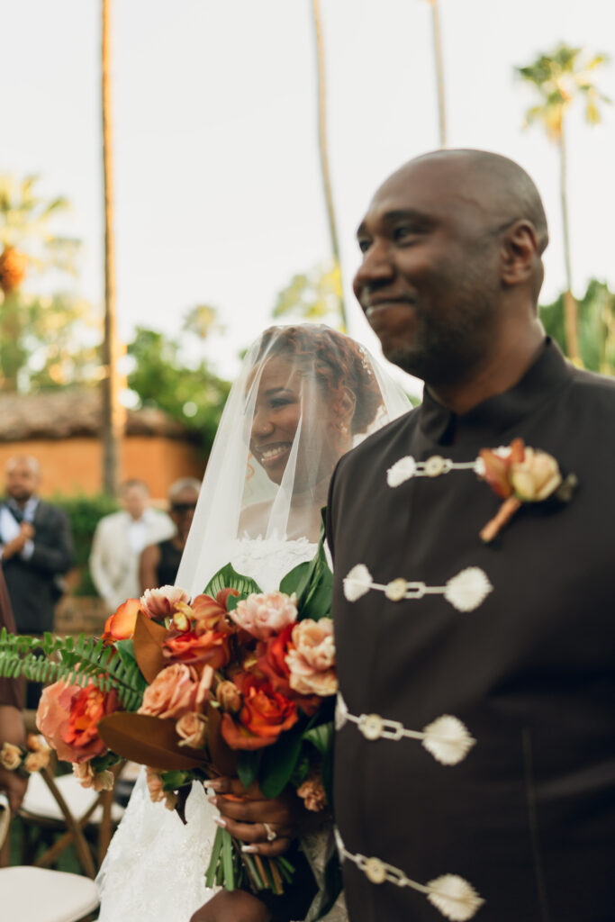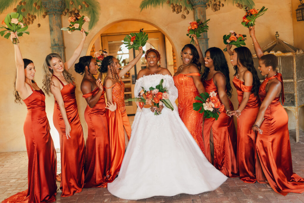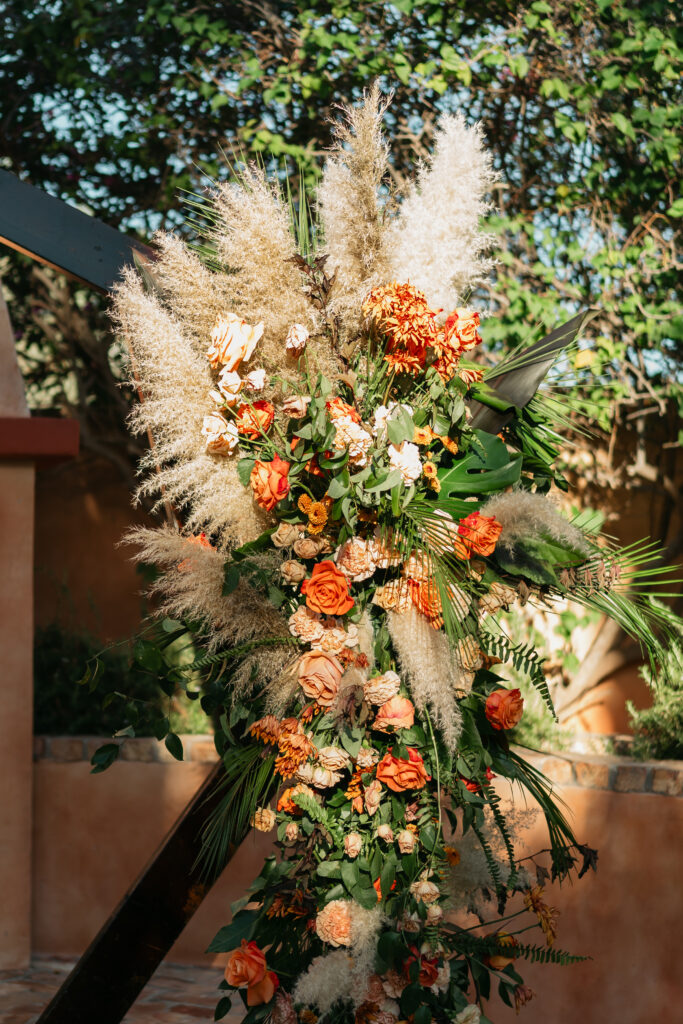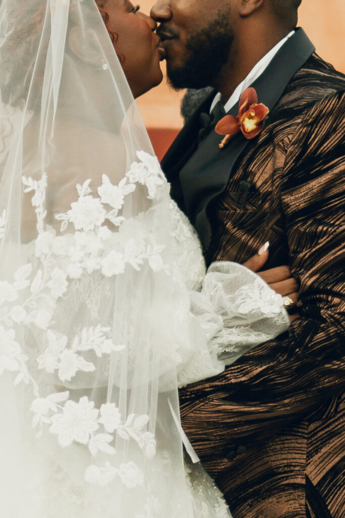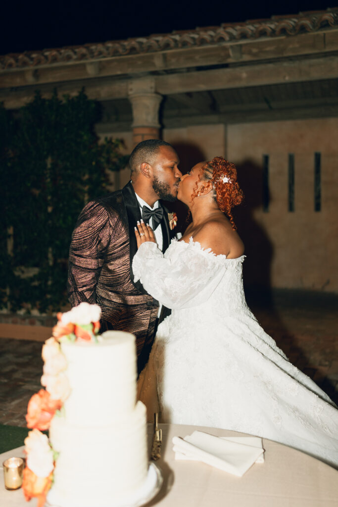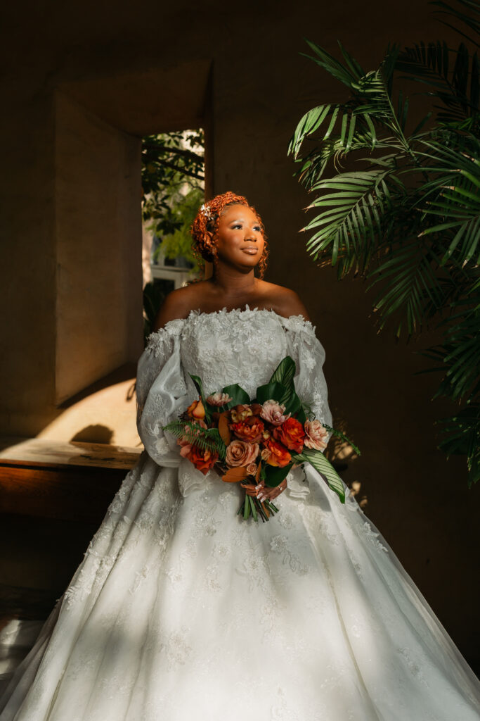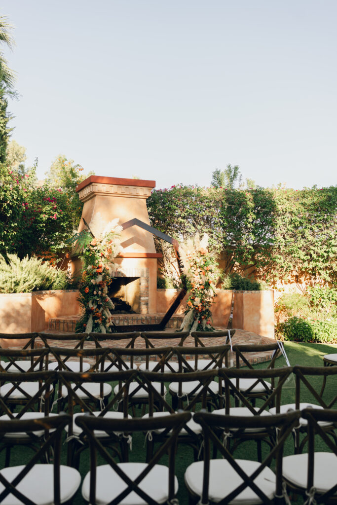 From my very first call with Kayaya, I knew this wedding would be two things: a huge, joy-filled party and a celebration rich with tropical elements inspired by her Congolese heritage. With Kayaya living in Texas and Meshach in Nashville, creating a wedding atmosphere that allowed them, and their guests, to “travel” somewhere new together felt especially meaningful. The moment Kayaya stepped onto the grounds of Royal Palms, she knew it was her dream venue. From that point forward, her vision never wavered: warm, saturated hues, real palm leaves, and gold accents that brought a lush, tropical feel to the Arizona desert.